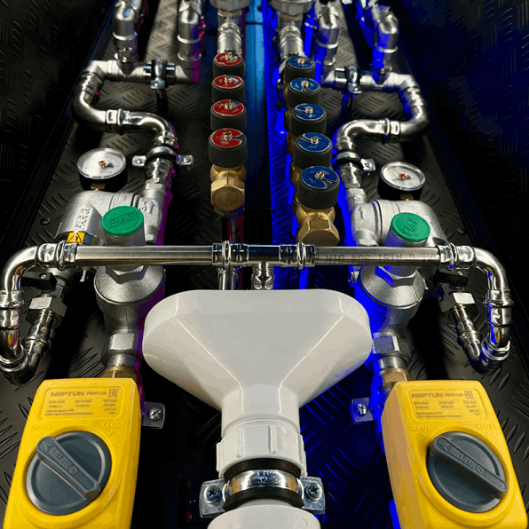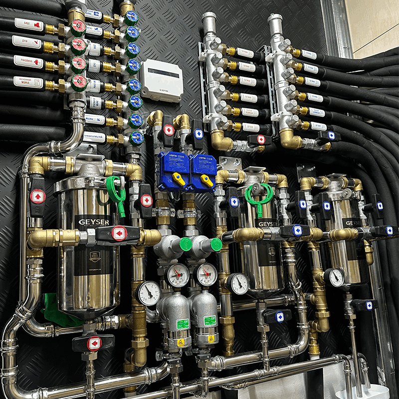 Сборка узла ввода воды: счётчики, фильтры, редукторы давления, краны. Аккуратно, компактно и удобно для обслуживания.